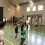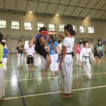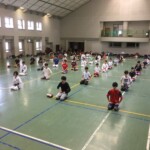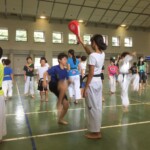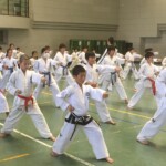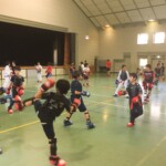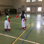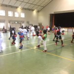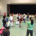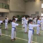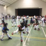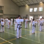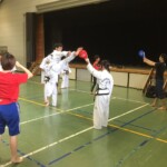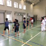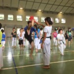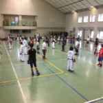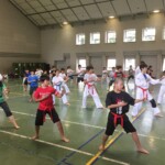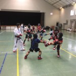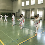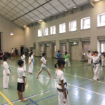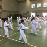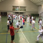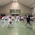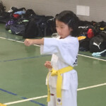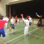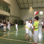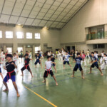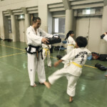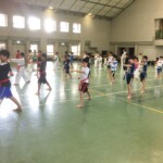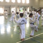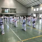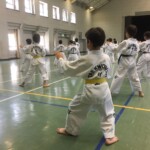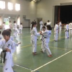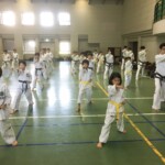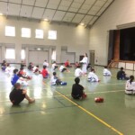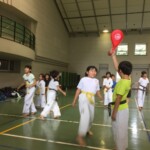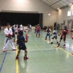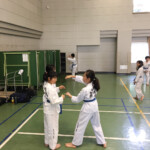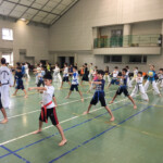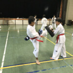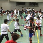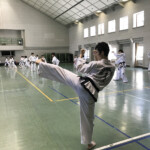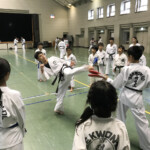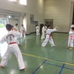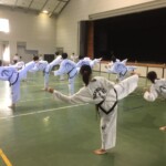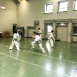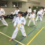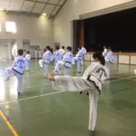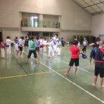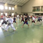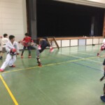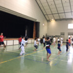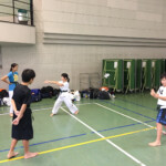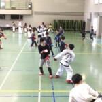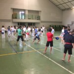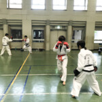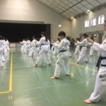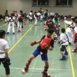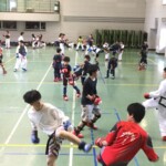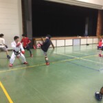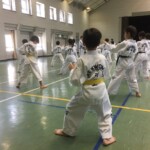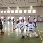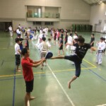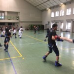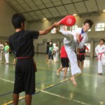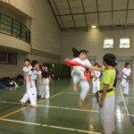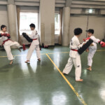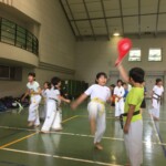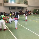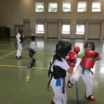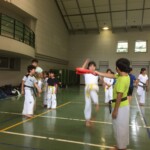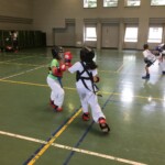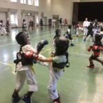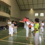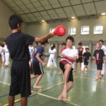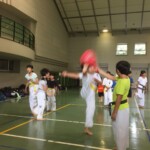 後半、上級者はコンビネーション練習、中級者はミット蹴り、昇級審査受審予定の黄帯は審査課題と飛び蹴りの練習。